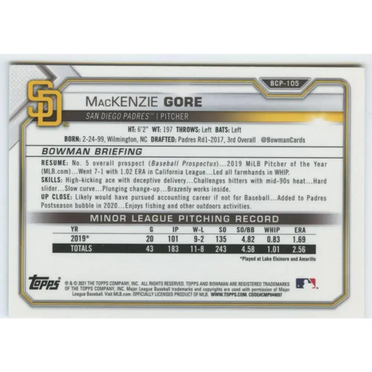 2021 Bowman Chrome Mega Box Mojo Refractor #BCP-105 MacKenzie Gore NM-MT San Diego Padres Baseball Card