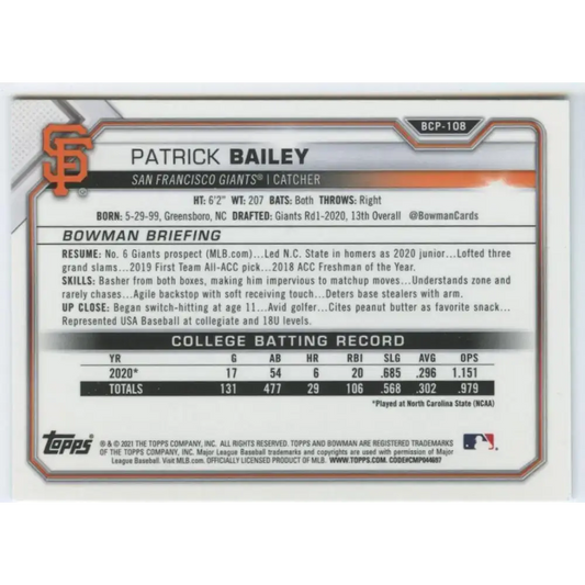 2021 Bowman Chrome Mega Box Mojo Refractor #BCP-108 Patrick Bailey NM-MT San Francisco Giants Baseball Card