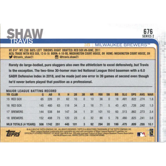 2019 Topps #676 Travis Shaw NM-MT Milwaukee Brewers Baseball Card