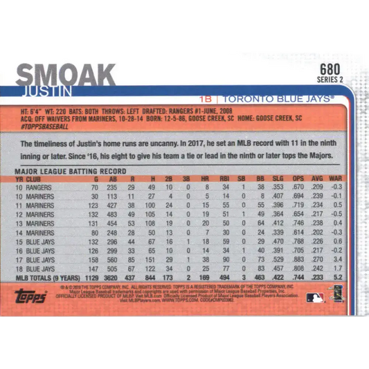 2019 Topps #680 Justin Smoak NM-MT Toronto Blue Jays Baseball Card