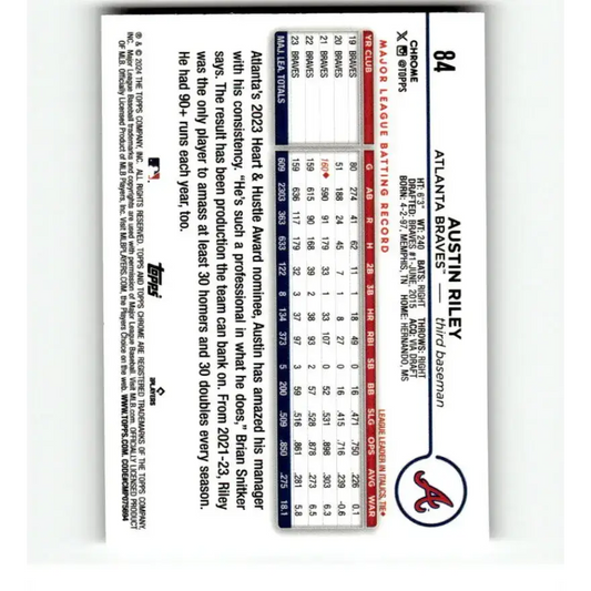 2024 Topps Chrome Refractor Sepia #84 Austin Riley NM-MT Atlanta Braves Baseball Card