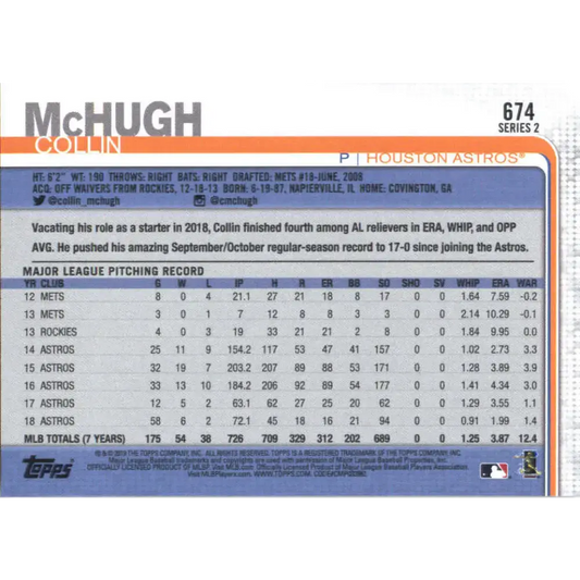2019 Topps #674 Collin McHugh NM-MT Houston Astros Baseball Card