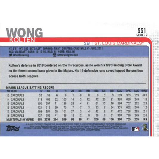 2019 Topps #551 Kolten Wong NM-MT St. Louis Cardinals Baseball Card