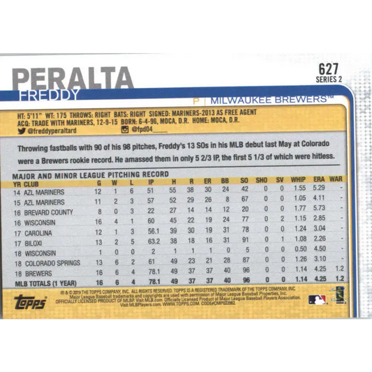 2019 Topps #627 Freddy Peralta NM-MT Milwaukee Brewers Baseball Card
