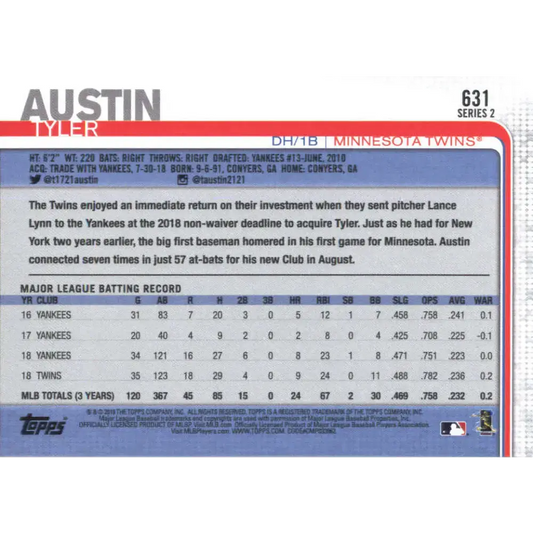 2019 Topps #631 Tyler Austin NM-MT Minnesota Twins Baseball Card