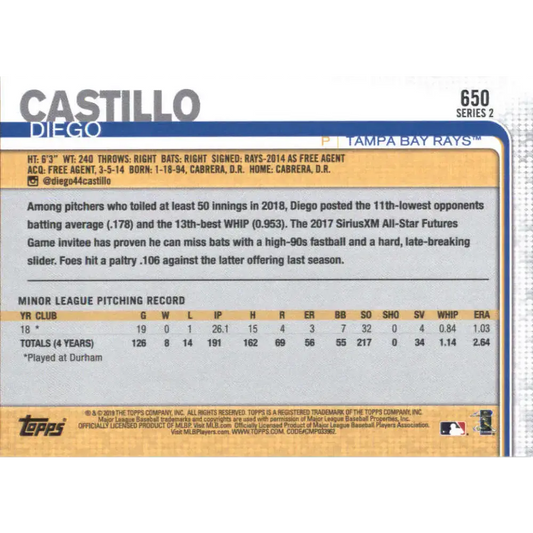 2019 Topps #650 Diego Castillo NM-MT RC Rookie Tampa Bay Rays Baseball Card