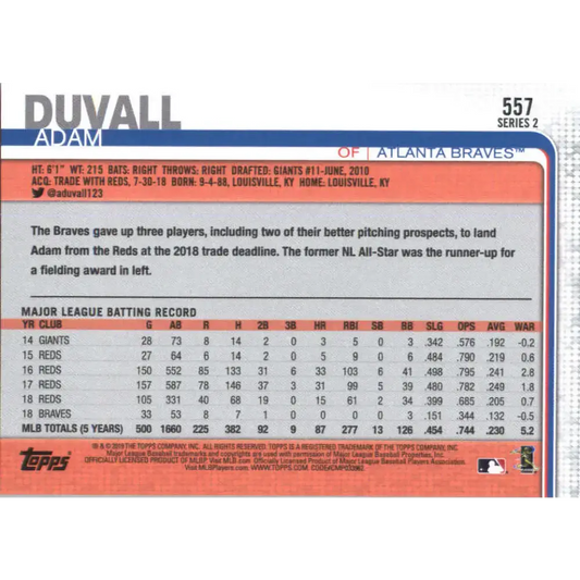 2019 Topps #557 Adam Duvall NM-MT Atlanta Braves Baseball Card