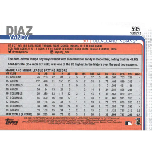 2019 Topps #595 Yandy Diaz NM-MT Cleveland Indians Baseball Card