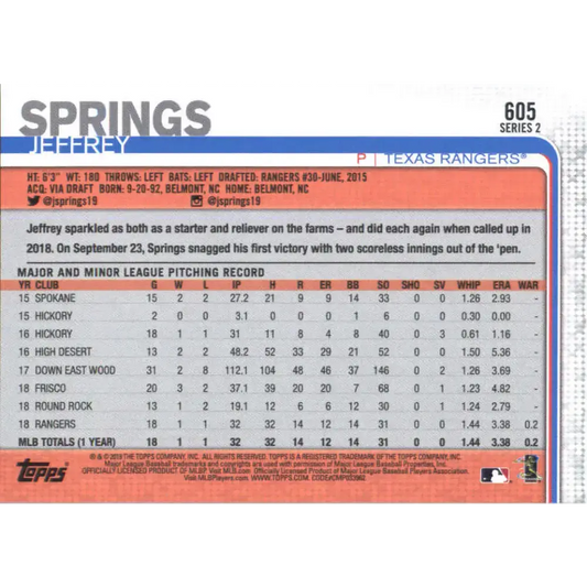 2019 Topps #605 Jeffrey Springs NM-MT RC Rookie Texas Rangers Baseball Card