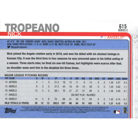 2019 Topps #615 Nick Tropeano NM-MT Los Angeles Angels Baseball Card