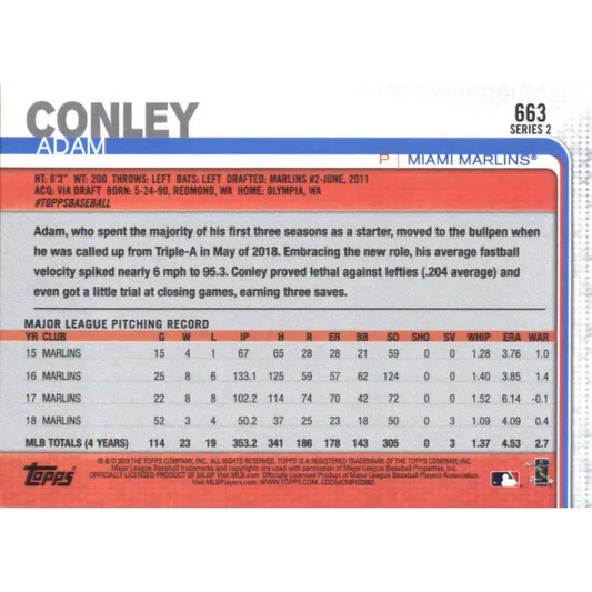 2019 Topps #663 Adam Conley NM-MT Miami Marlins Baseball Card