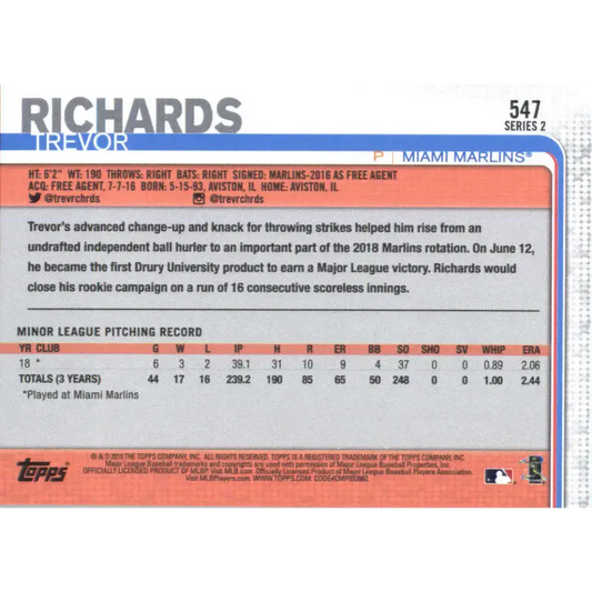 2019 Topps #547 Trevor Richards NM-MT RC Rookie Miami Marlins Baseball Card