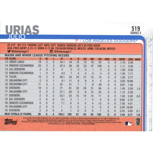 2019 Topps #519 Julio Urias NM-MT Los Angeles Dodgers Baseball Card