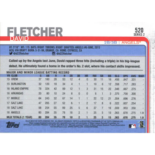 2019 Topps #520 David Fletcher NM-MT RC Rookie Los Angeles Angels Baseball Card