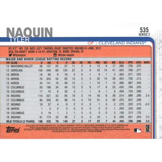 2019 Topps #535 Tyler Naquin NM-MT Cleveland Indians Baseball Card