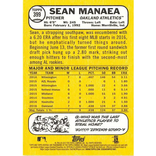 2017 Topps Heritage #399 Sean Manaea NM-MT Oakland Athletics Baseball Card