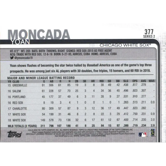 2019 Topps #377 Yoan Moncada NM-MT Chicago White Sox Baseball Card