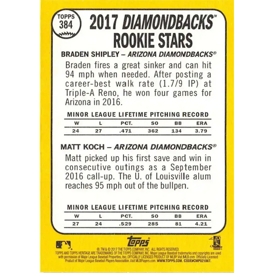 2017 Topps Heritage #384 Braden Shipley/Matt Koch NM-MT RC Rookie Arizona Diamondbacks Baseball Card
