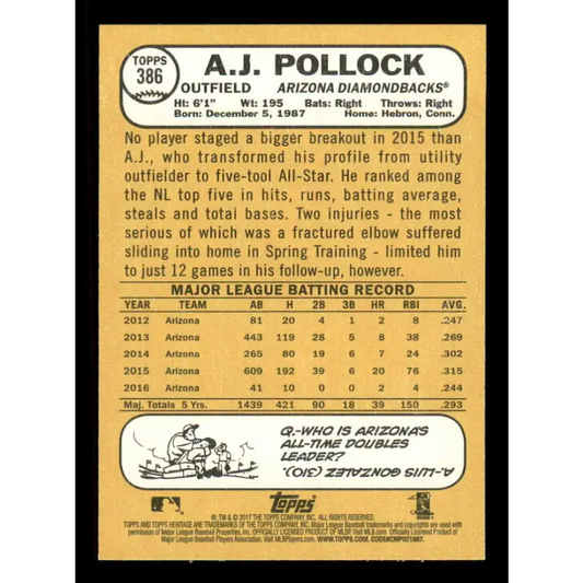 2017 Topps Heritage #386 A.J. Pollock NM-MT Arizona Diamondbacks Baseball Card