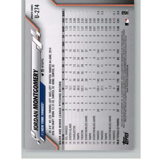 2020 Topps Update #U-274 Jordan Montgomery NM-MT New York Yankees Baseball Card