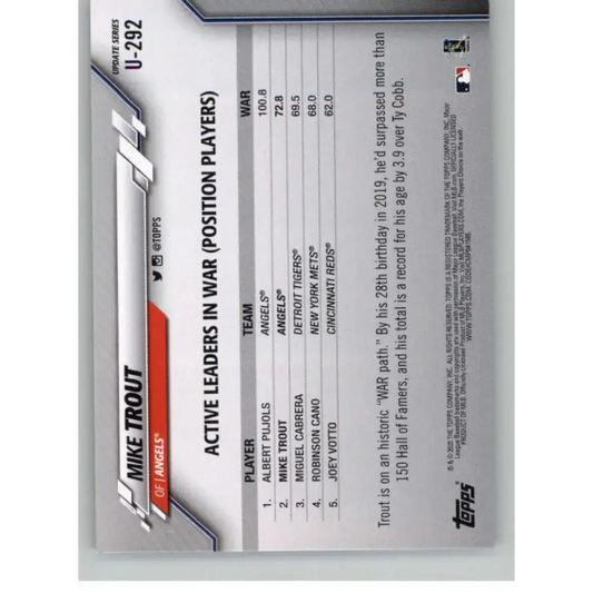 2020 Topps Update #U-292 Mike Trout NM-MT Los Angeles Angels Baseball Card