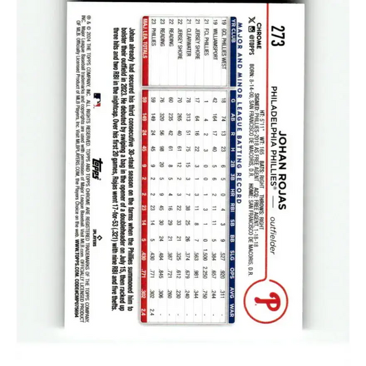 2024 Topps Chrome X-Fractor #273 Johan Rojas NM-MT RC Rookie Philadelphia Phillies Baseball Card