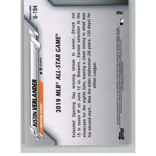 2020 Topps Update #U-194 Justin Verlander NM-MT Houston Astros Baseball Card