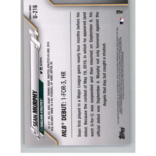 2020 Topps Update #U-216 Sean Murphy NM-MT Oakland Athletics Baseball Card