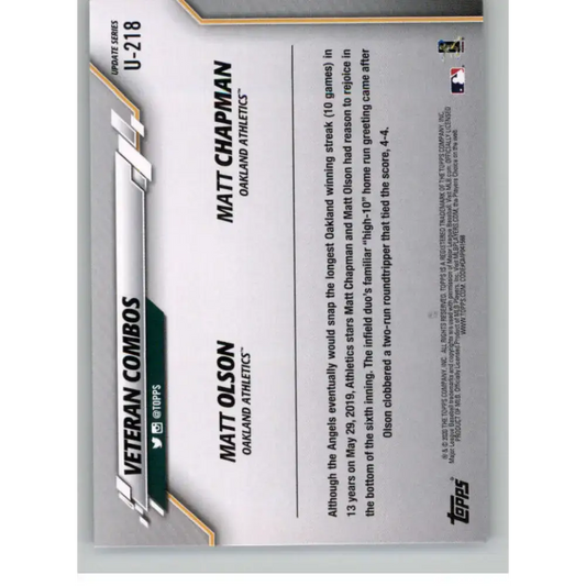 2020 Topps Update #U-218 Chapman/Olson NM-MT Oakland Athletics Baseball Card