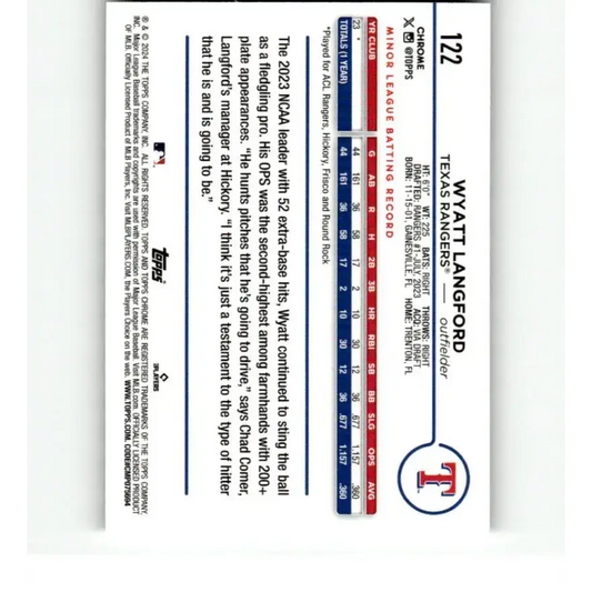 2024 Topps Chrome X-Fractor #122 Wyatt Langford NM-MT RC Rookie Texas Rangers Baseball Card
