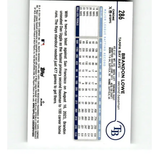 2024 Topps Chrome Refractor RayWave #286 Brandon Lowe NM-MT Tampa Bay Rays Baseball Card