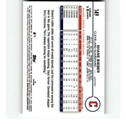 2024 Topps Chrome Refractor RayWave #149 Shane Bieber NM-MT Cleveland Guardians Baseball Card