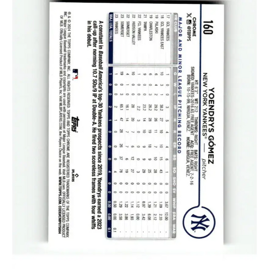 2024 Topps Chrome Refractor RayWave #160 Yoendrys Gomez NM-MT RC Rookie New York Yankees Baseball Card