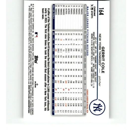 2024 Topps Chrome Refractor RayWave #164 Gerrit Cole NM-MT New York Yankees Baseball Card