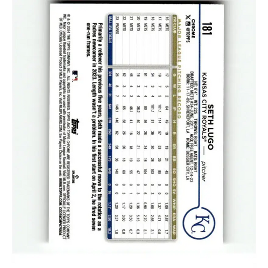 2024 Topps Chrome Refractor RayWave #181 Seth Lugo NM-MT Kansas City Royals Baseball Card