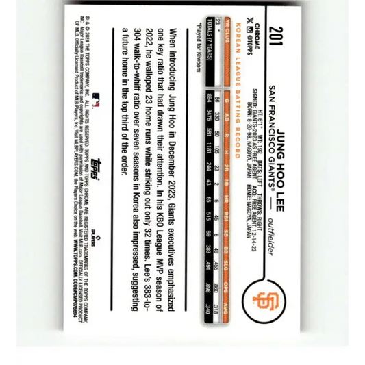 2024 Topps Chrome Refractor Pink #201 Jung Hoo Lee NM-MT RC Rookie San Francisco Giants Baseball Card