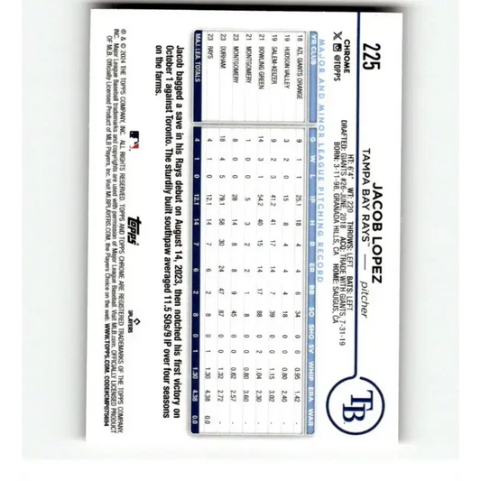 2024 Topps Chrome Refractor Pink #225 Jacob Lopez NM-MT RC Rookie Tampa Bay Rays Baseball Card