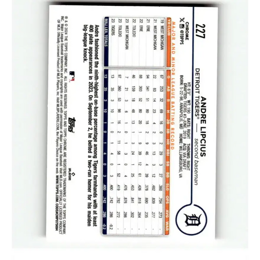 2024 Topps Chrome Refractor Pink #227 Andre Lipcius NM-MT RC Rookie Detroit Tigers Baseball Card