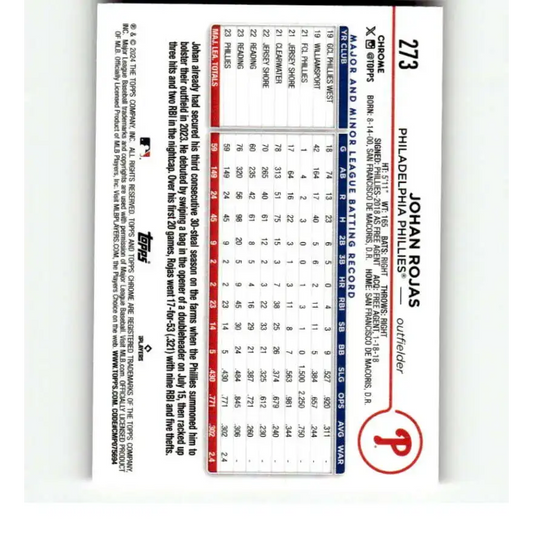 2024 Topps Chrome Refractor Pink #273 Johan Rojas NM-MT RC Rookie Philadelphia Phillies Baseball Card