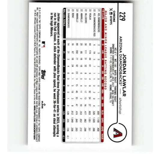 2024 Topps Chrome Refractor Pink #229 Jordan Lawlar NM-MT RC Rookie Arizona Diamondbacks Baseball Card