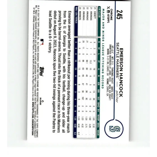 2024 Topps Chrome Refractor Pink #245 Emerson Hancock NM-MT RC Rookie Seattle Mariners Baseball Card