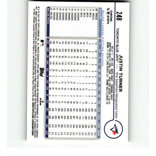 2024 Topps Chrome Refractor Pink #248 Justin Turner NM-MT Toronto Blue Jays Baseball Card