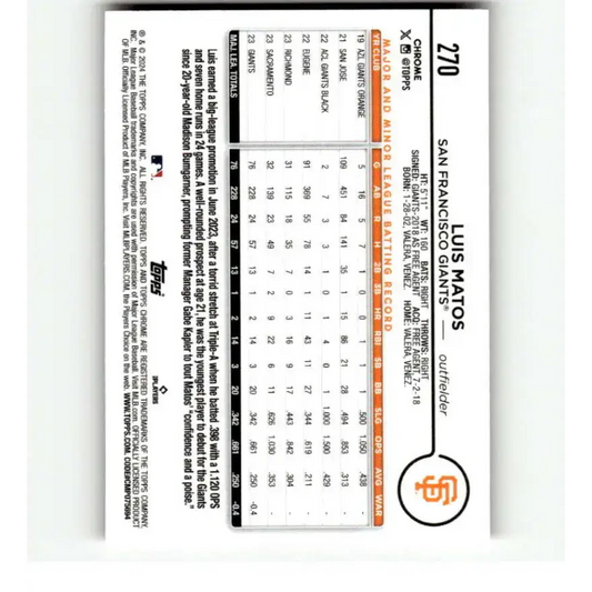 2024 Topps Chrome Refractor Pink #270 Luis Matos NM-MT RC Rookie San Francisco Giants Baseball Card