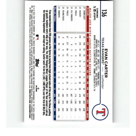 2024 Topps Chrome Refractor Pink #136 Evan Carter NM-MT RC Rookie Texas Rangers Baseball Card