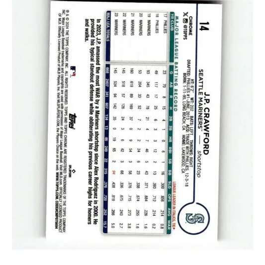 2024 Topps Chrome Refractor Pink #14 J.P. Crawford NM-MT Seattle Mariners Baseball Card