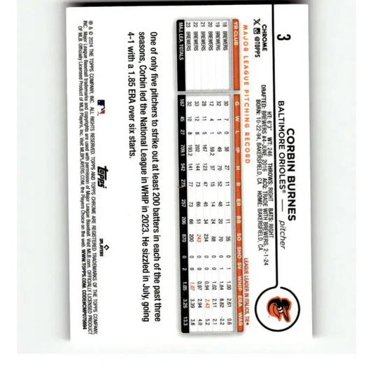 2024 Topps Chrome Refractor Pink #3 Corbin Burnes NM-MT Baltimore Orioles Baseball Card