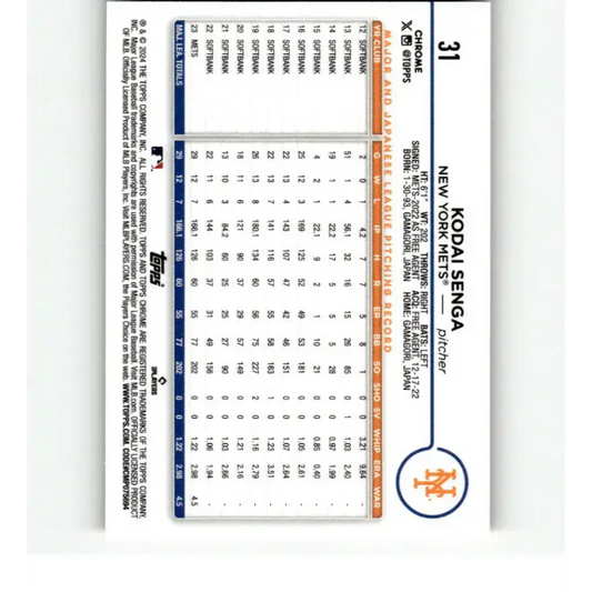 2024 Topps Chrome Refractor Pink #31 Kodai Senga NM-MT New York Mets Baseball Card