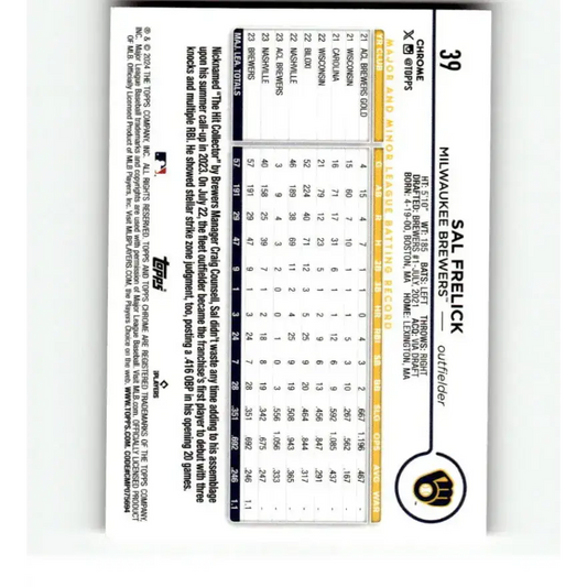 2024 Topps Chrome Refractor Pink #39 Sal Frelick NM-MT RC Rookie Milwaukee Brewers Baseball Card