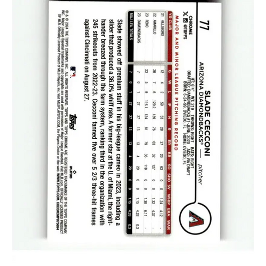 2024 Topps Chrome Refractor Pink #77 Slade Cecconi NM-MT RC Rookie Arizona Diamondbacks Baseball Card