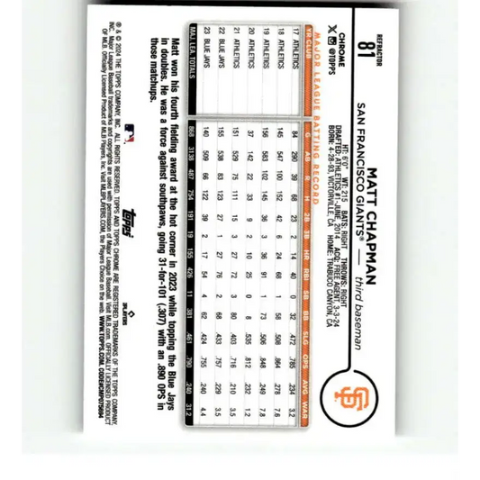 2024 Topps Chrome Refractor #81 Matt Chapman NM-MT San Francisco Giants Baseball Card